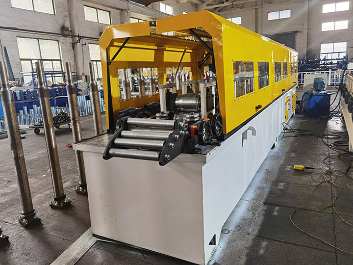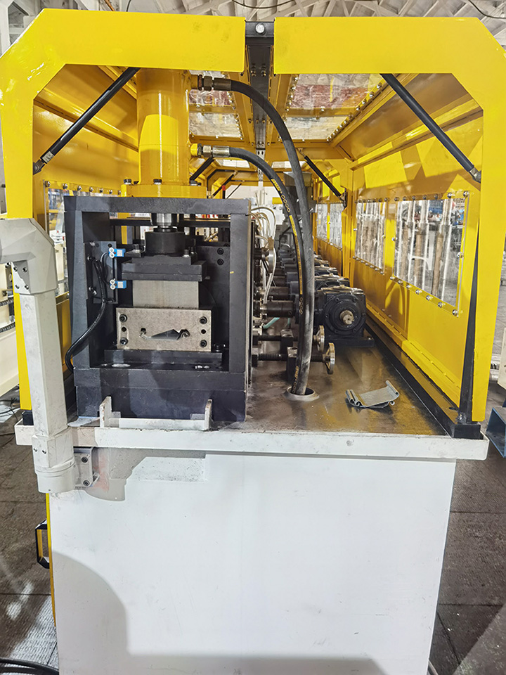 2) Metal Shutter Door Roll Forming Machine rollers Rollers manufactured from high quality bearing steel GCr15, CNC lathes, Heat Treatment. with black treatment or Hard-Chrome Coating for options. With feeding material guide, body framemade from 400# H type steel by welding 3) Metal door frame roll forming machine post cutter