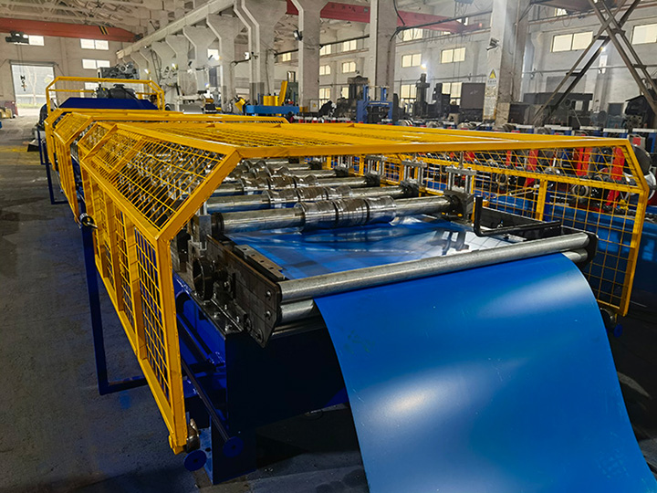 Through decoiling, continuous rolling and cold-forming, the coil sheets are automatically cut to the size and specification required. The stacking of finished panel can be also done automatically. It adopts PLC control, AC frequency and speed adjusting technology to realize continuous work automatically. The roll former is energy-saving and high-effective to be used for trapezoidal or corrugated steel.