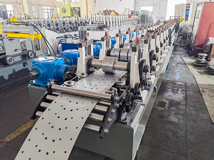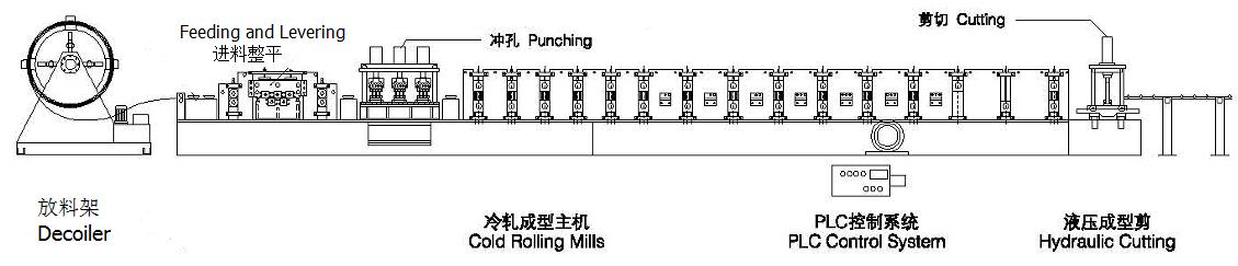 1.Description of Warehouse Racks Roll Forming Machine This machine takes galvanized steel or cold rolled steel as the raw materials, through the a series steps to form it into a shelving profile with specific shape and size. The forming steps devices include decoiler, Feeding and Leveling Device, Hydraulic Punching device,main forming mill, hydraulic post-cutter. The inverter controls the motor speed, the PLC system controls length and quantity automatically, therefore, the machine achieves a continuous automatic production, which is the ideal equipment for cold roll forming industry. 2.Detail Warehouse Racks Roll Forming Machine Flow Chart Decoiler →Feeing and Leveling Device→Hydrualic Punching device →Main forming machine → Hydraulic post-cutting→Exit rack.